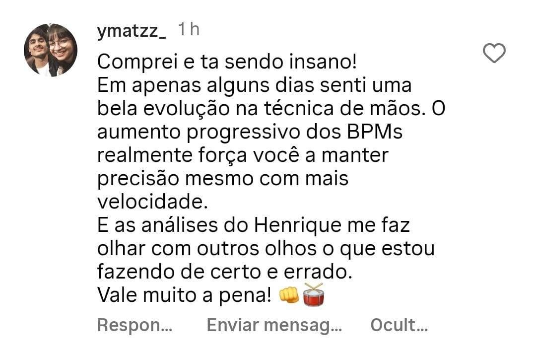 Você receberá feedbacks personalizados sobre como você está rendendo no curso. Analisarei sua técnica, velocidade e movimentação pela bateria.