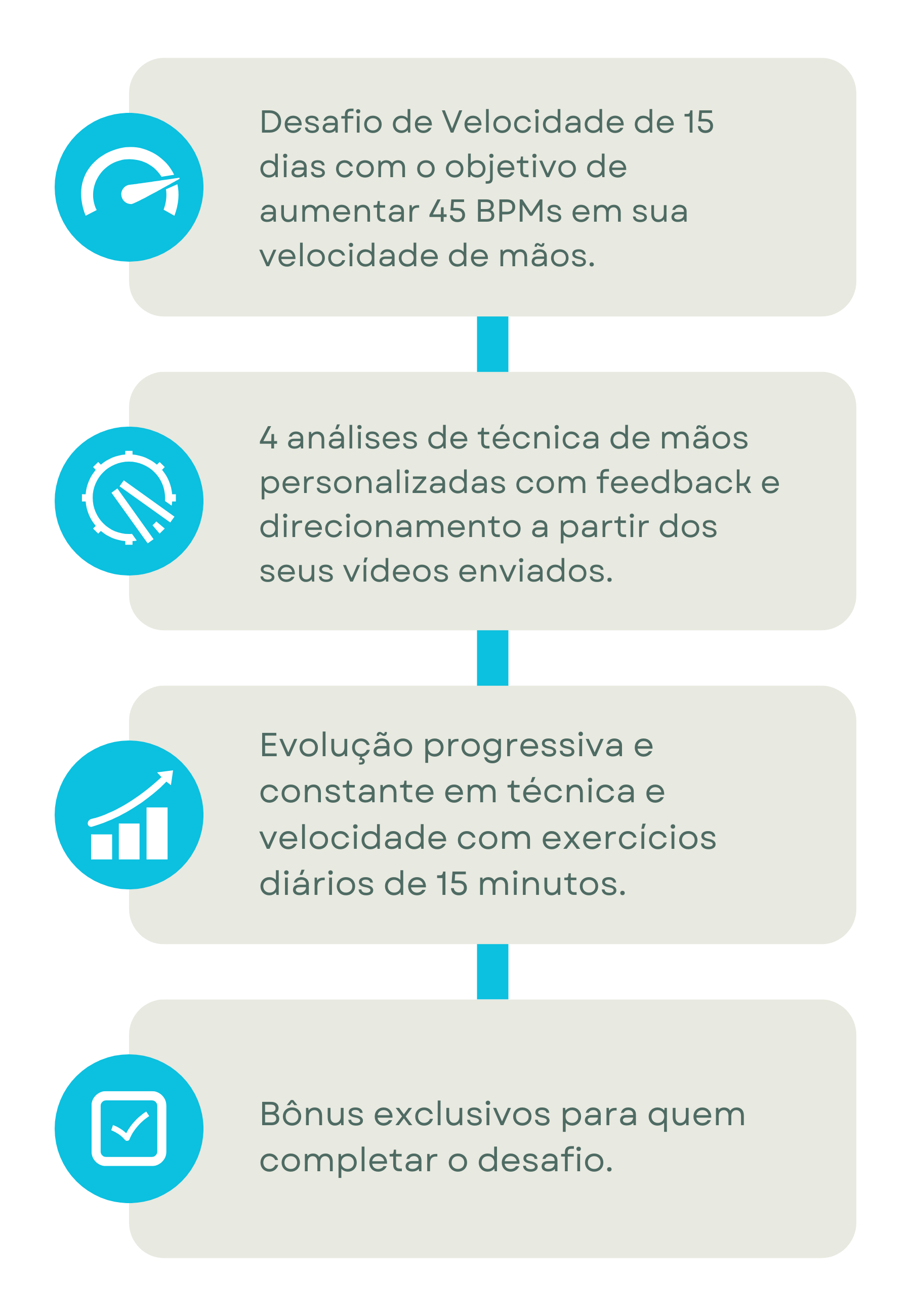 Você saberá auto corrigir sua técnica se estiver errada, terá acompanhamento individual e conseguirá aumentar sua velocidade de maneira regrada fazendo com que sua técnica acompanhe o ritmo de desenvolvimento do seu corpo, fazendo assim com que consiga tocar altas velocidades com uma técnica apurada.